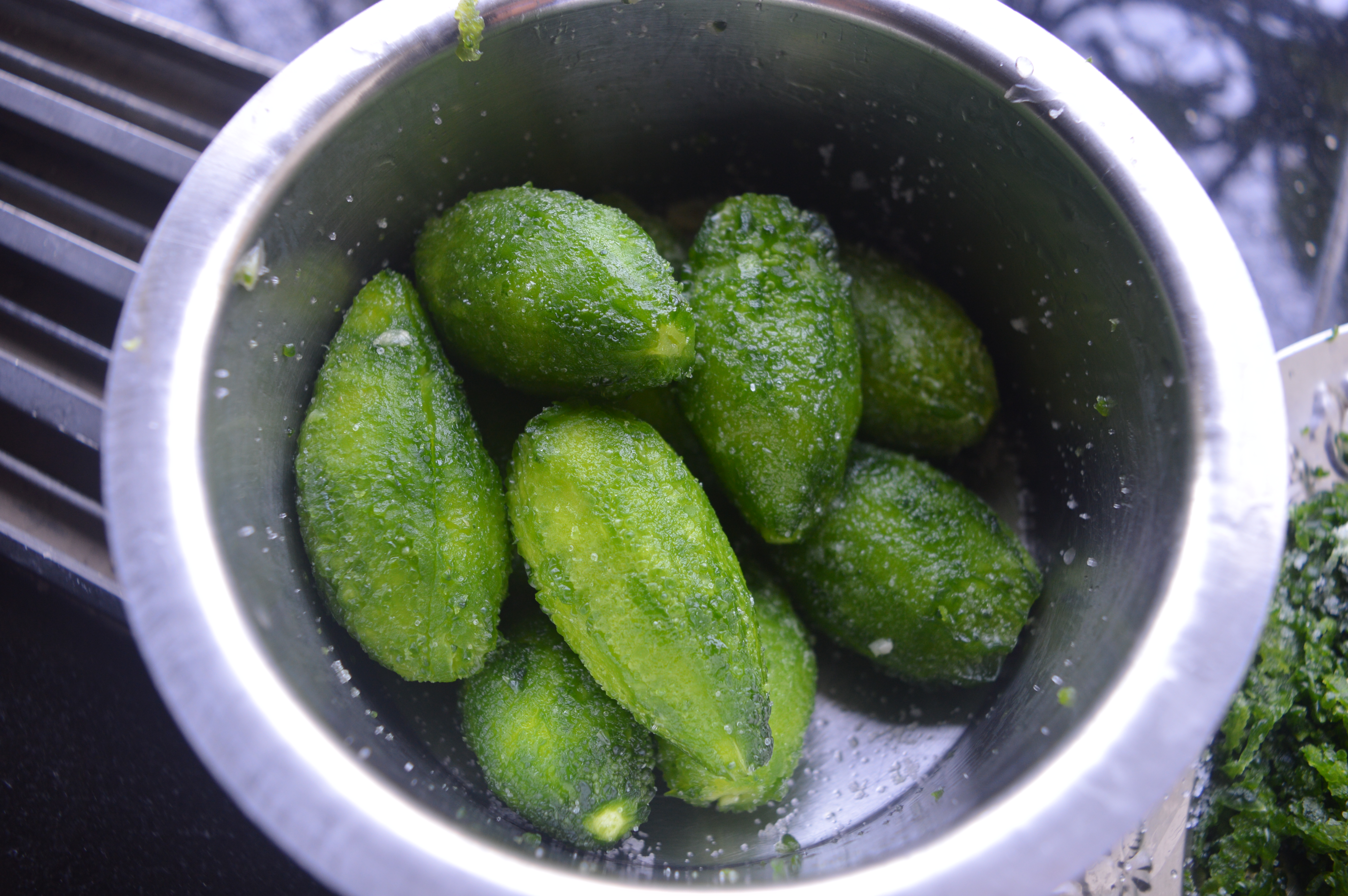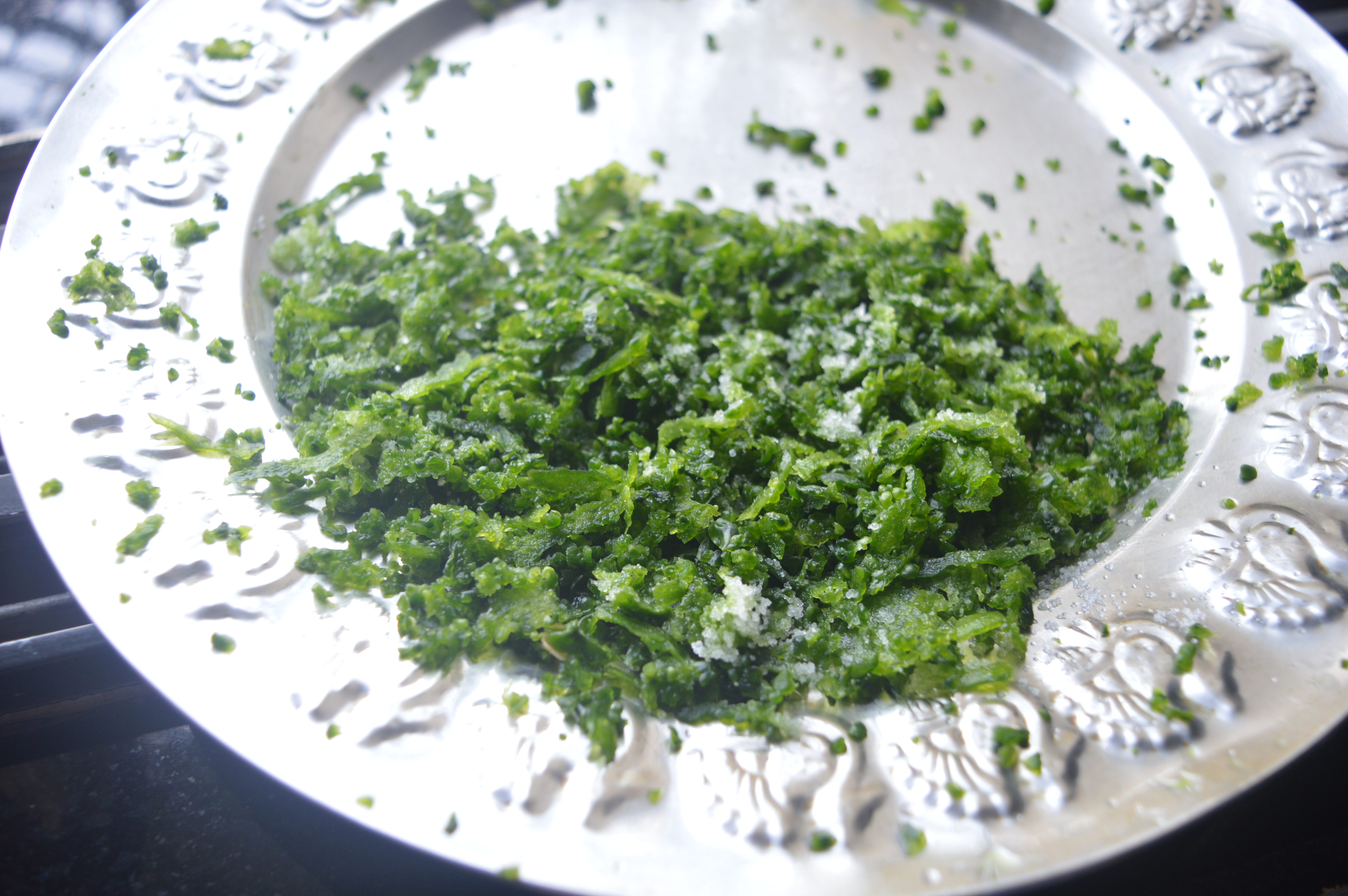 - Wash the peeled gourds and sprinkle some salt and leave it for 5-10 minutes. Salt will reduce the bitterness.