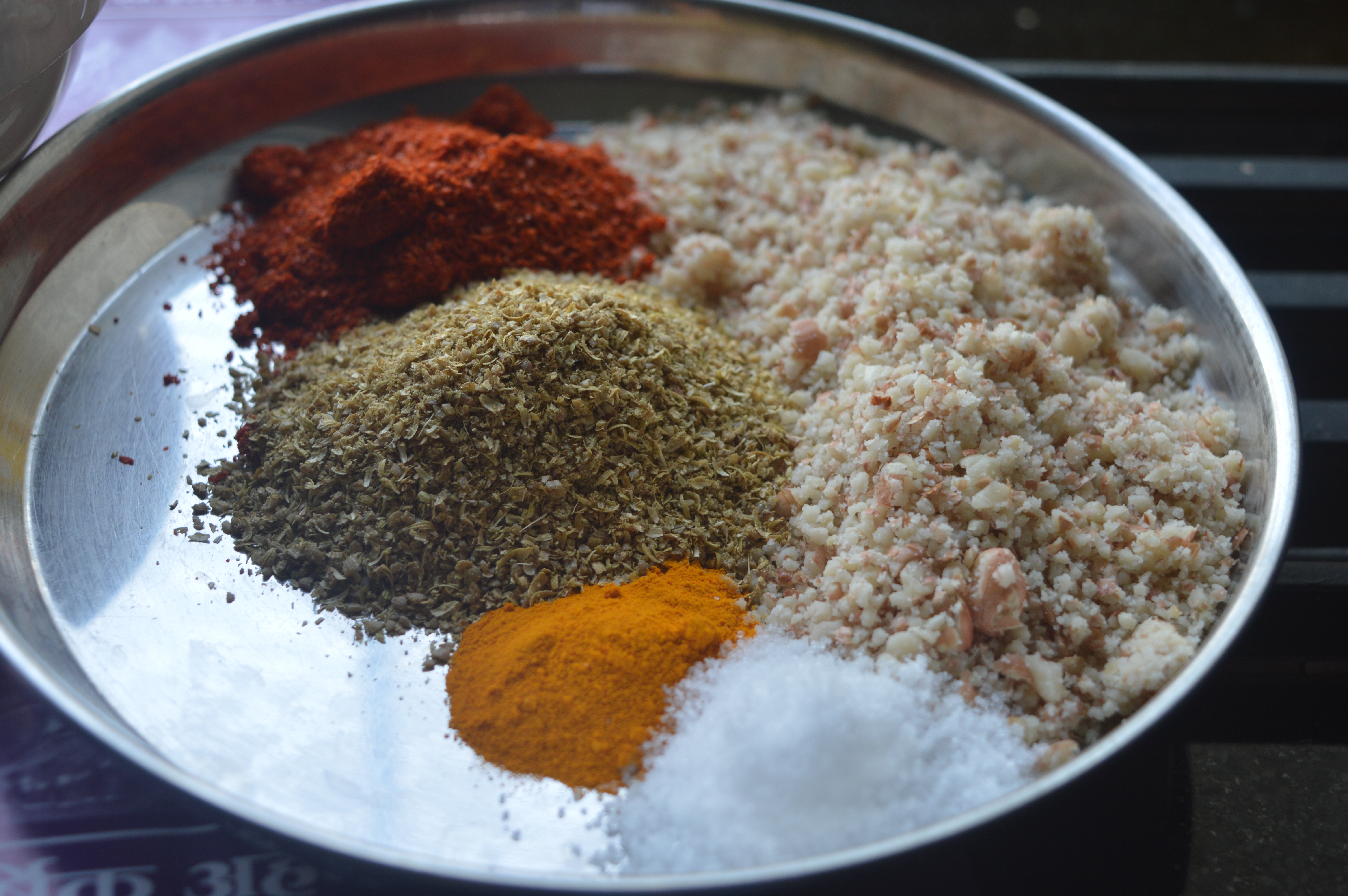 - Meanwhile in a plate prepare the stuffing. Mix all the dry ingredients and a little oil and water so as to bind the mixture.