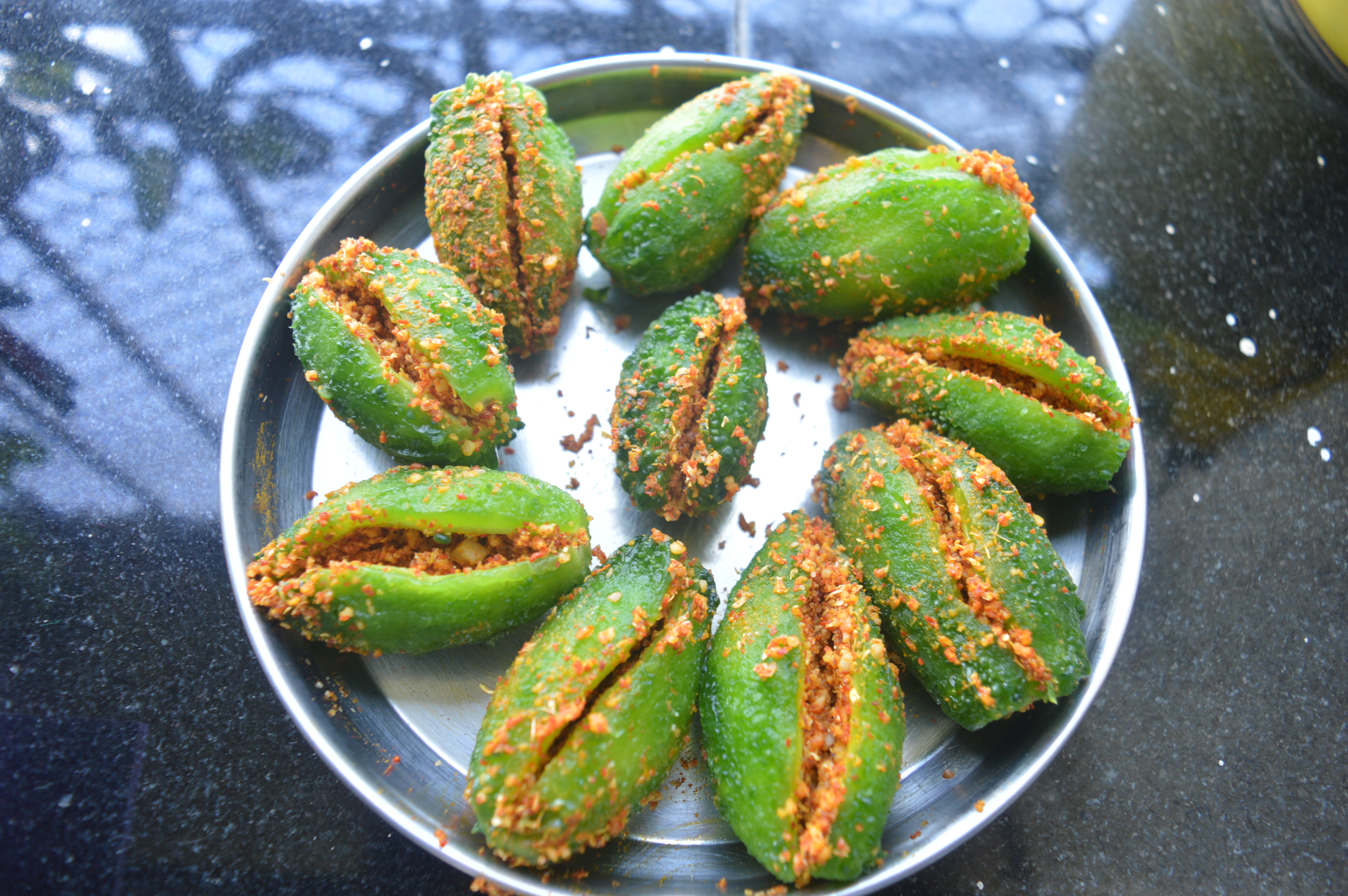 - The Bitter gourds are ready to be served. Garnish it with desiccated coconut.